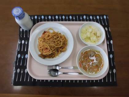 スパゲティーナポリタン・牛乳・コンソメスープ・コーンポテト