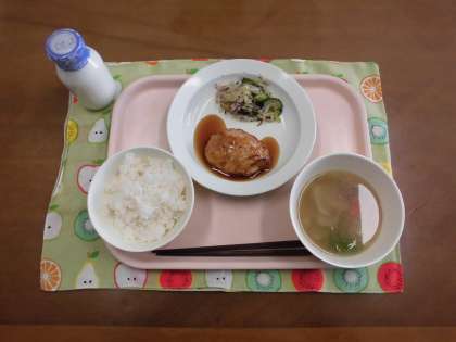 ごはん・牛乳・豆腐ハンバーグ・野菜のゆかりあえ・かぶのスープ