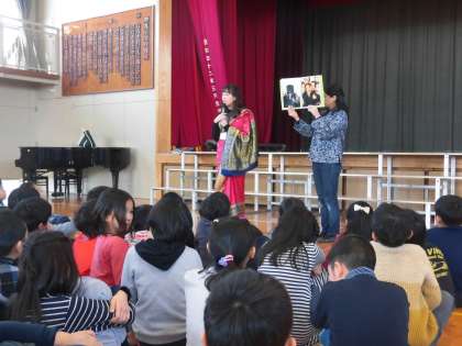 総合的な学習の時間「世界の国調べ」の一環として、ゲストティーチャーを招いた国際理解教室の授業を行いました。アジアから欧米まで、様々な民族衣装がずらり。それぞれの国の言葉でのあいさつから始まりました。