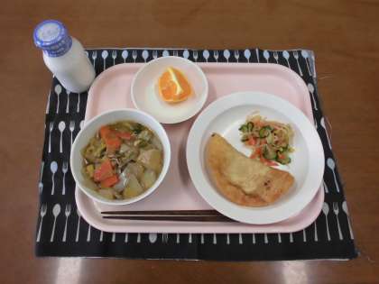 カレーうどん・牛乳・ジャンボぎょうざ・野菜のおかかあえ