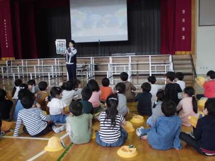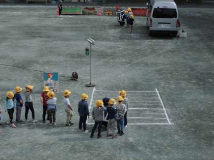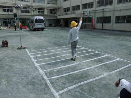 横断歩道の歩き方を、DVDを見たり実際に校庭に作った横断歩道を渡ったりして、学習しました。ご家庭でも、交通安全について話し合う時間を作ってみてください。