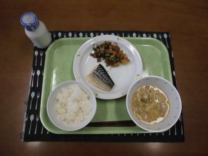 今日の献立)ごはん・牛乳・魚の塩焼き・刻み昆布の五目煮・みそ汁