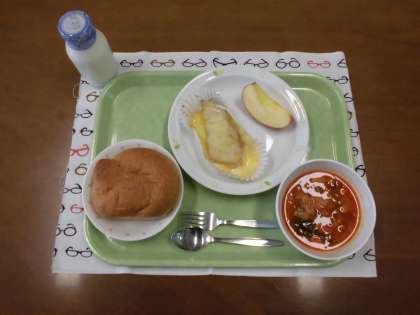 今日の献立)胚芽パン・牛乳・魚のチーズ焼き・ミネストローネスープ・果物(りんご)