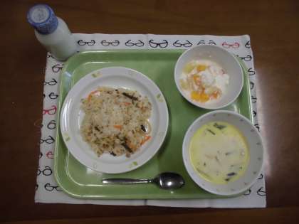 今日の献立)山菜ピラフ・牛乳・ポテトスープ・フルーツヨーグルト