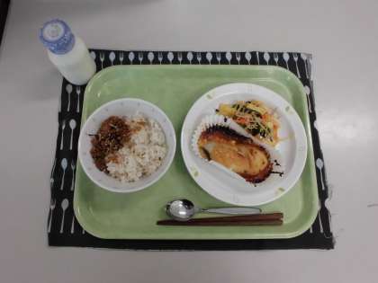 今日の献立)麦ごはん・牛乳・かみかみ佃煮・魚のみそマヨネーズ焼き・カリカリおあげのおひたし