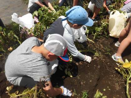 農家の方が3月ごろに種イモを植えて育てて下さった男爵イモを収穫体験させてもらいました。