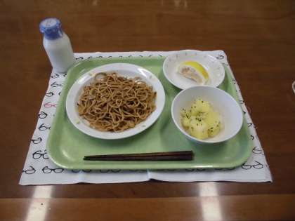 今日の献立)ソース焼きそば・牛乳・パセリポテト・果物(河内晩柑)