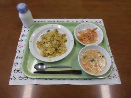 今日の献立)カレーピラフ・牛乳・卵スープ・ぱりぱりサラダ