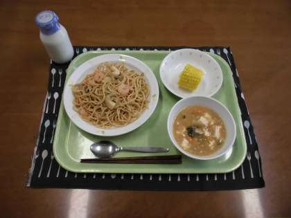 今日の献立)海鮮焼きそば・牛乳・麻婆汁・ゆでとうもろこし