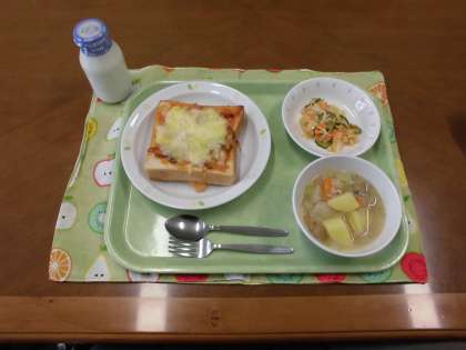 今日の献立)ピザトースト・牛乳・ポトフ。野菜のイタリアンドレッシングかけ