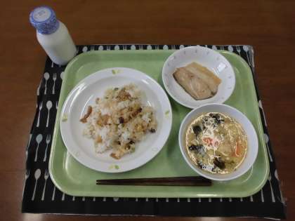 今日の献立)まめまめおこわ・牛乳・魚のしょうが風味焼き・かきたま汁