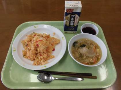今日の献立)キムチチャーハン・麦茶・肉団子入り春雨スープ・ぶどうゼリー