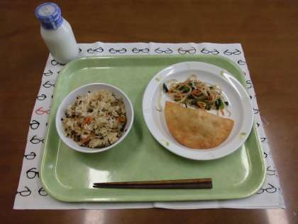今日の献立)ひじきごはん・牛乳・ジャンボぎょうざ・ナムル