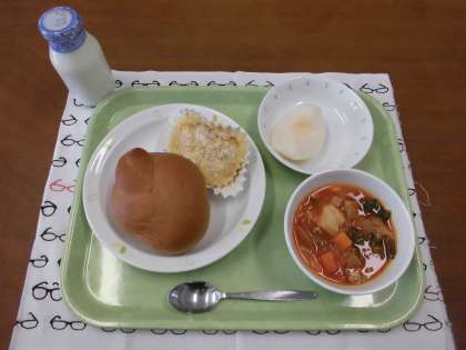 今日の献立)黒砂糖パン・牛乳・ポテトのクリーム焼き・ミネストローネスープ・果物 (梨)