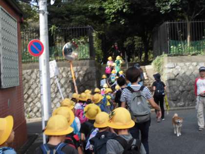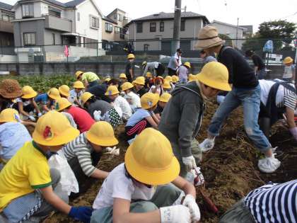 今日は、秋山農園へ、さつまいも掘りにいきました。1年生117人全員で、環状七号線を渡り、駒沢公園を通り、長い道のりをがんばって歩きました。農園では、秋の恵みと、育ててくださった農家の皆さんに感謝して、たくさんのさつまいもを収穫しました。