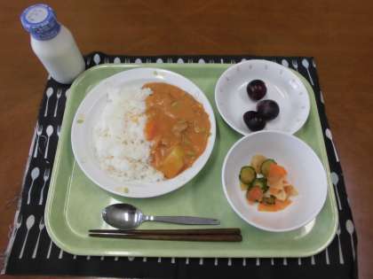 今日の献立)ハッシュドポークライス・牛乳・シャキシャキ野菜・果物(ピオーネ)