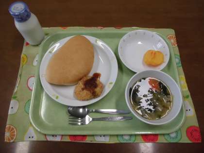 今日の献立)ショートニングパン・牛乳・コロッケ・野菜スープ・果物(柿)