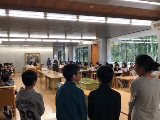 朝会では、校長先生に昨日の登山や宿舎での過ごし方についてお話をいただきました。