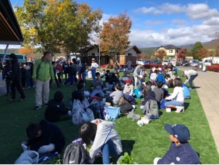 おうちの人から預かったお小遣いでお土産を買ったら、芝生の上に集まってお昼ご飯。