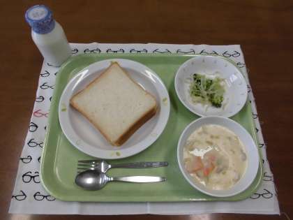 今日の献立)ドライカレーサンド・牛乳・クリームシチュー・ブロッコリーのサラダ