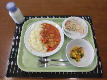 今日の献立)チリビーンズライス・牛乳・魚のガーリック焼き・パンプキンサラダ