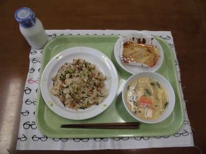 今日の献立)五目ごはん・牛乳・魚のみそマヨネーズ焼き・にらたまスープ
