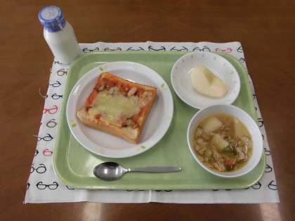 今日の献立)ピザトースト・牛乳・白いんげんの田舎風スープ・果物(ラ・フランス)