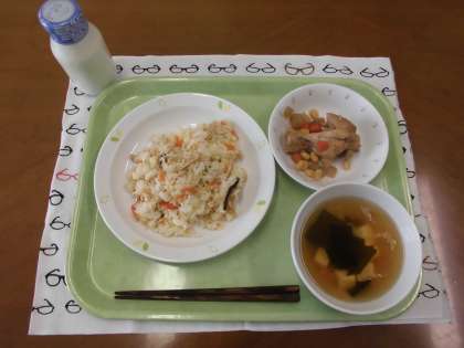 今日の献立)子ぎつね寿司・牛乳・すまし汁・大豆と手羽のやわらか煮