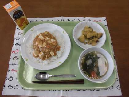今日の献立)マーボー豆腐丼・みかんジュース・春雨スープ・さつまいもの甘辛煮