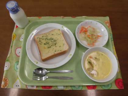 今日の献立)ガーリックトースト・牛乳・パンプキンシチュー・キャベツサラダ