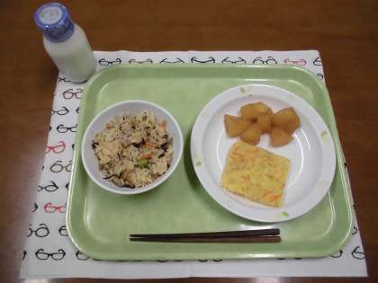 今日の献立)ひじきごはん・牛乳・切り干し大根の卵焼き・じゃがいもの甘辛煮
