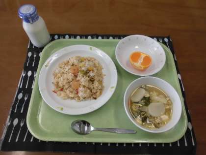 今日の献立)ナシゴレン・牛乳・韓国風スープ・果物(みかん)