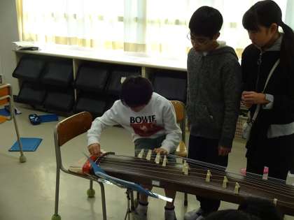 18日に音楽室で、箏・三味線教室がありました。クラスごとに、ゲストティチャーとしてお招きした地域の方に教わりました。箏には子どもたち全員が触れ、「さくらさくら」を演奏しました。三味線も演奏することができ、楽しそうに練習していました。最後は先生たちとセッションをして、日本の伝統芸能に触れた一日となりました。