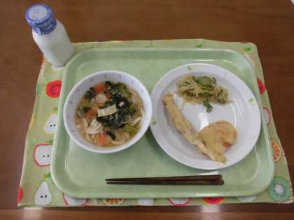 今日の献立)そぼろあんかけうどん・牛乳・天ぷら(じゃがいも・ししゃも)・野菜のごま風味