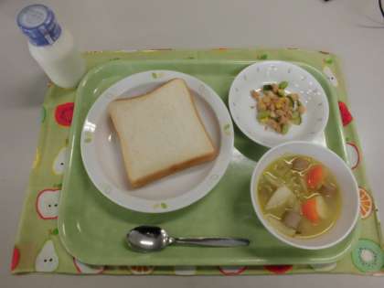 今日の献立)ジャムサンド(イチゴジャム)・牛乳・ポトフ・ビーンズサラダ