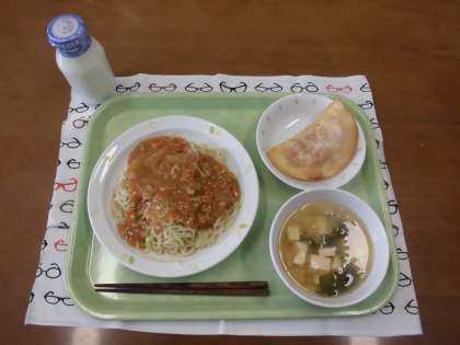 今日の献立)ジャージャー麺・牛乳・中華スープ・ゆずりんごパイ