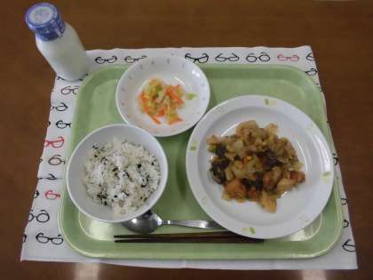 今日の献立)わかめごはん・牛乳・くじらとコーンの揚げ煮・辣白菜(ラーパーツァイ)