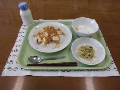 今日の献立)マーボー豆腐丼・牛乳・野菜の中華風味・フルーツヨーグルト