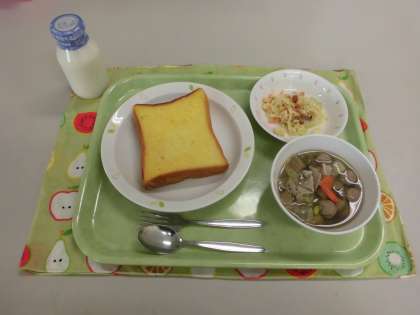 「オレンジフレンチトースト」。フレンチトーストは卵や牛乳、砂糖を混ぜ合わせた卵液をパンに浸して焼く献立です。今日はその卵液にオレンジジュースを加えて作った特製卵液に浸して仕上げました。