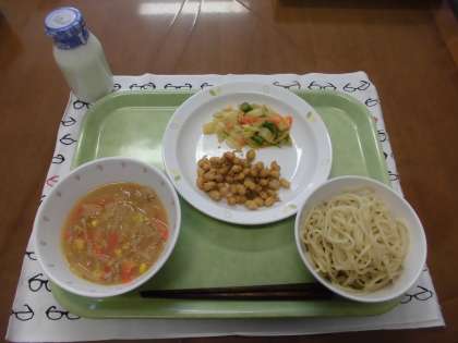 今日の献立)中丸ラーメン・牛乳・春野菜サラダ・大豆とじゃこの甘辛あげ