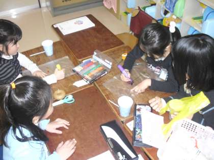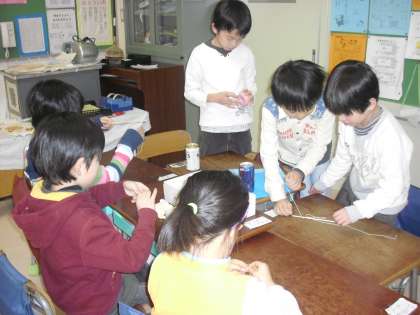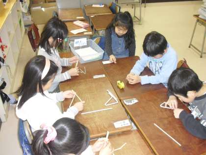 各班ごとに、2年生から「魚つり」や「ブーメラン」などのおもちゃの作り方を教えてもらいました。