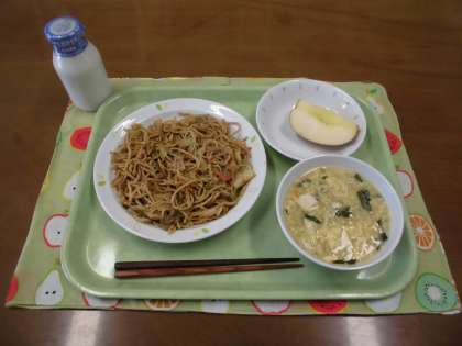 今日の献立)ソース焼きそば・牛乳・にらたまスープ・果物(りんご)