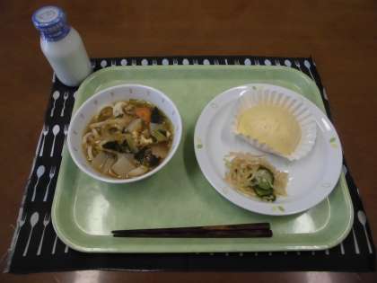 今日の献立)和風カレーうどん・牛乳・蒸しパン・糸寒天と野菜のあえ物