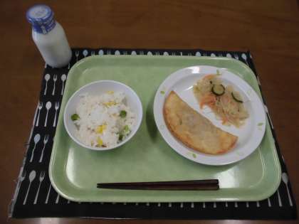 今日の献立)グリンピースごはん・牛乳・ジャンボぎょうざ・春雨サラダ