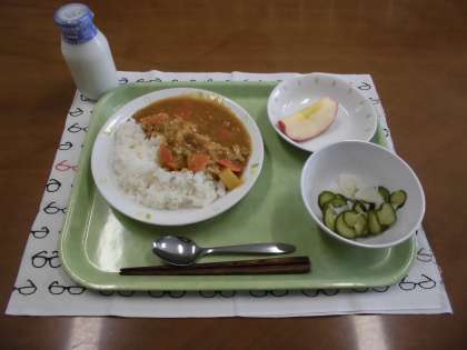 今日の献立)チキンカレーライス・牛乳・ピクルス・くだもの(りんご)