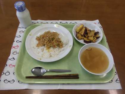 今日の献立)そぼろ丼・牛乳・野菜スープ・大学芋