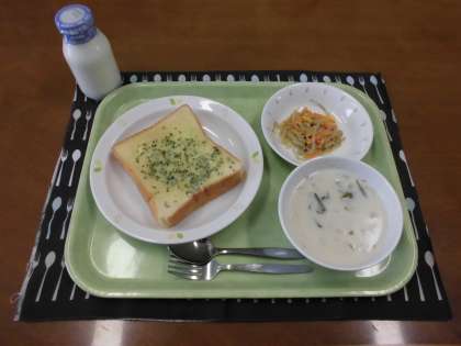 今日の献立)ガーリックトースト・牛乳・マカロニのクリーム煮・にんじんサラダ