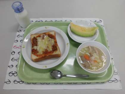 今日の献立)ピザトースト・牛乳・ポトフ・くだもの(メロン)