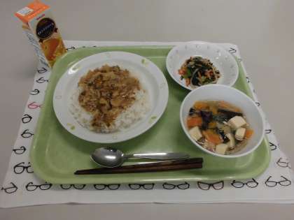 今日の献立)スタミナ丼・みかんジュース・春雨スープ・青菜ののりあえ