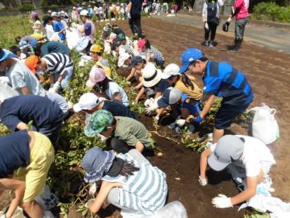 晴天のもと、秋山農園へじゃがいも堀りに行ってきました。葉や茎を掴んで引き抜いたり、手で土を掘ったりして沢山収穫することができました。帰り道も、収穫したじゃがいもを背負い、学校まで歩ききった子どもたち。「たくさんとれたよ。」「夕飯はポテトサラダにしてもらおう。」など笑顔がこぼれました。